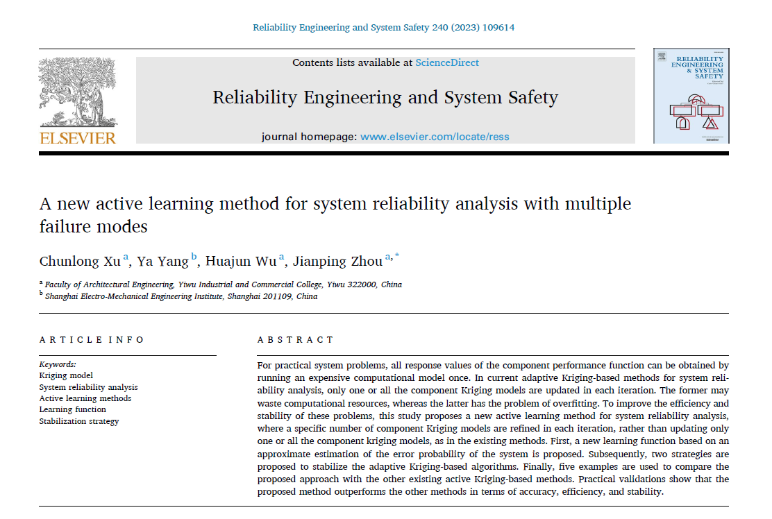 近日,建筑工程学院教师徐春龙作为第一作者,义乌工商职业技术学院作为第一单位和唯一通讯作者单位,在《Reliability Engineering and System Safety》发表了可靠性分析的相关文章。文章名为“A new active learning method for system reliability analysis with multiple failure modes”,该期刊是可靠性、安全领域顶级期刊(中国科学院分区升级版工程技术大类一区Top期刊,影响因子8.1)。