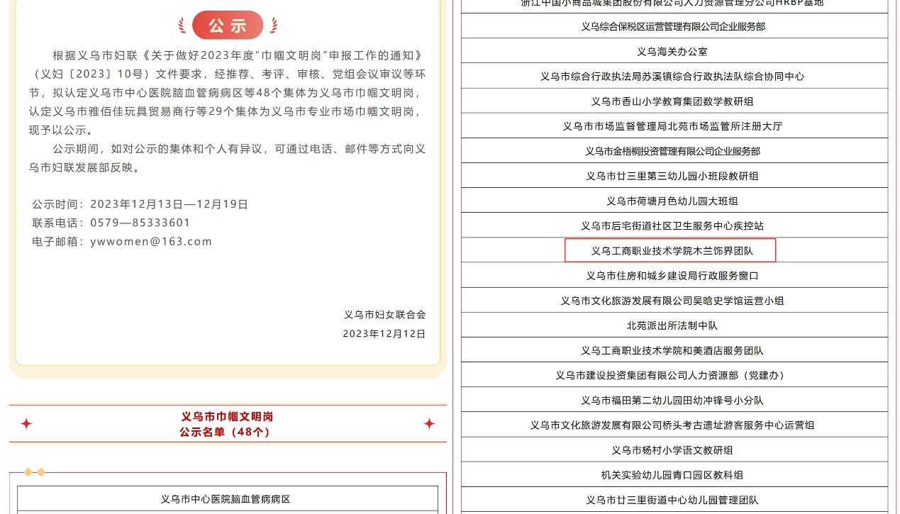 近日,2023年度义乌市级“巾帼文明岗”评选出炉,我院建筑装饰工程技术专业(“木兰饰界团队”)获此殊荣。