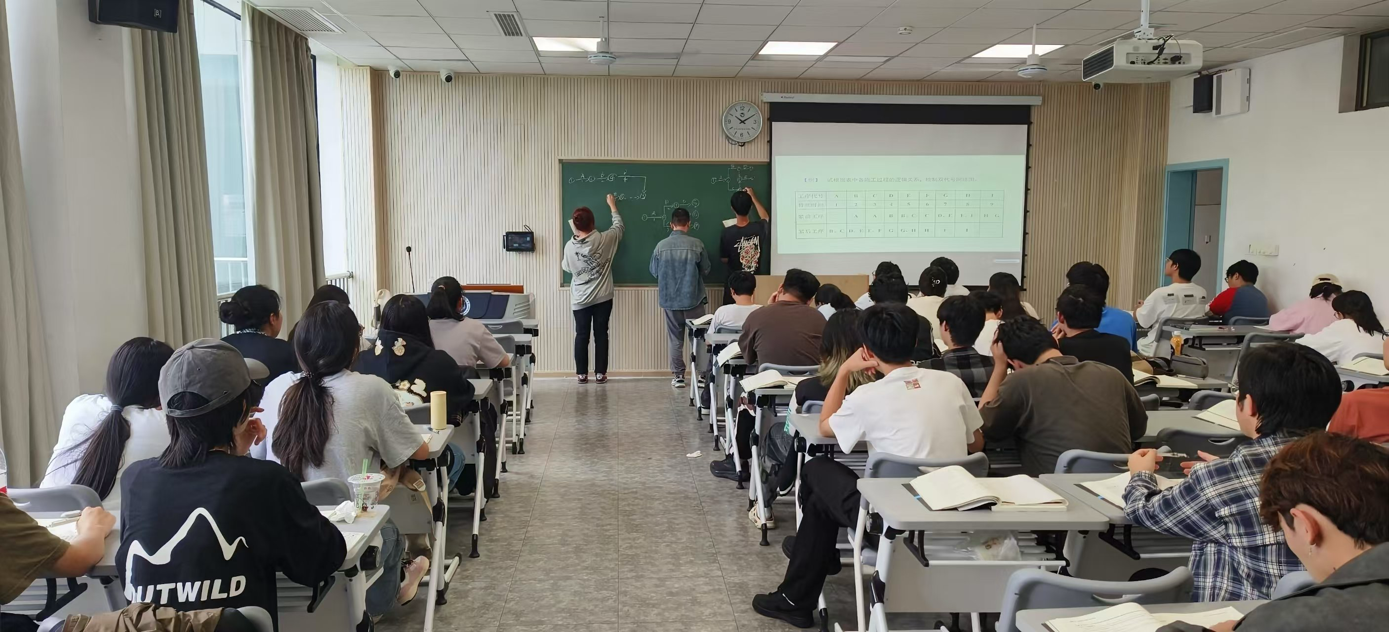 初筱老师从网络计划技术的现实应用入手,引入单代号网络计划与双代号网络计划。主要结合例题讲解了单双网络计划图的绘制规范与逻辑关系。课堂中师生互动良好,学生就单双网络计划图绘制展开讨论,并邀请多位学生到黑板上展示绘图成果,其余同学积极评价并指出问题,课堂氛围活跃。