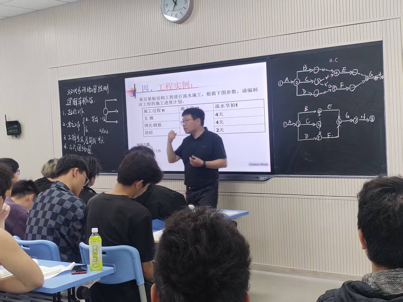 本次公开课的授课主题为双代号网络图的绘制(逻辑草稿法)。上课前,教师和学生都进行了充分准备,学生座位排布井井有条,平常学习主动性不足的学生被安排在了第一排。教学过程中,先从上次课程内容回顾开始,检查学生的巩固效果;之后引入新课,采用任务驱动法抛出问题,之后教师演示解法,其中穿插理论知识要点和关键路径,侧重探讨分析课程重点和难点。教师完成演示后,再布置新任务,让学生自行完成。最后剩余两分钟,用于课堂总结。课程设置条理清晰、路线明确,课堂时间掌控恰如其分,全体学生都能从头到尾认真融入,课堂教学效果堪称完美。