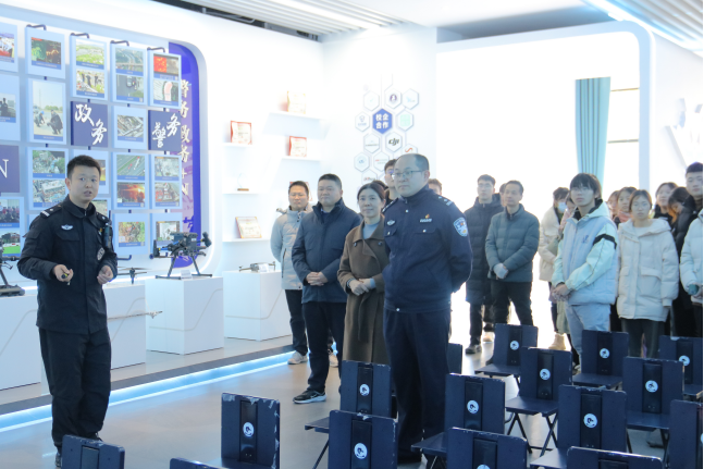 活动第一站,参观义乌市公安局巡特警大队周晓航工作室。龚龙飞副大队长、周晓航中队长围绕无人机的分解构件、型号类型、无人机操作的法律法规等内容为师生代表进行了讲解,并实地走访了周晓航工作室,深入了解工作室日常训练的规章制度。期间,双方共同见证了义乌工商职业技术学院建筑工程学院—义乌市公安局巡特警大队大思政课教学实践基地签约仪式,并为龚龙飞、周晓航两位校外人生导师颁发聘书,为双方合作交流打下坚实基础。